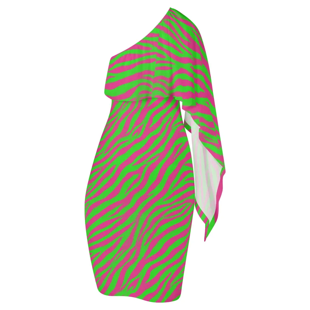 Green-Pink Tiger Stripe Evening Dress with One Shoulder – Unleash Your Confidence and Style with Every Step