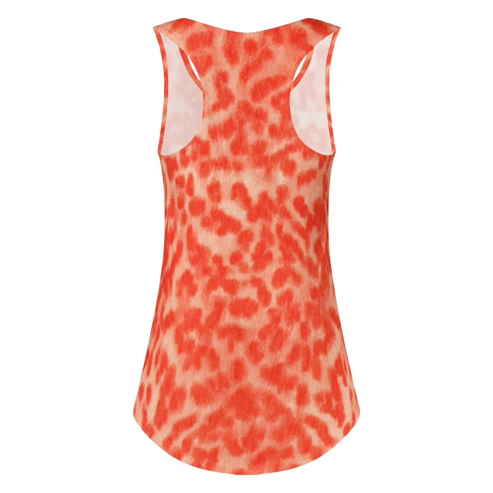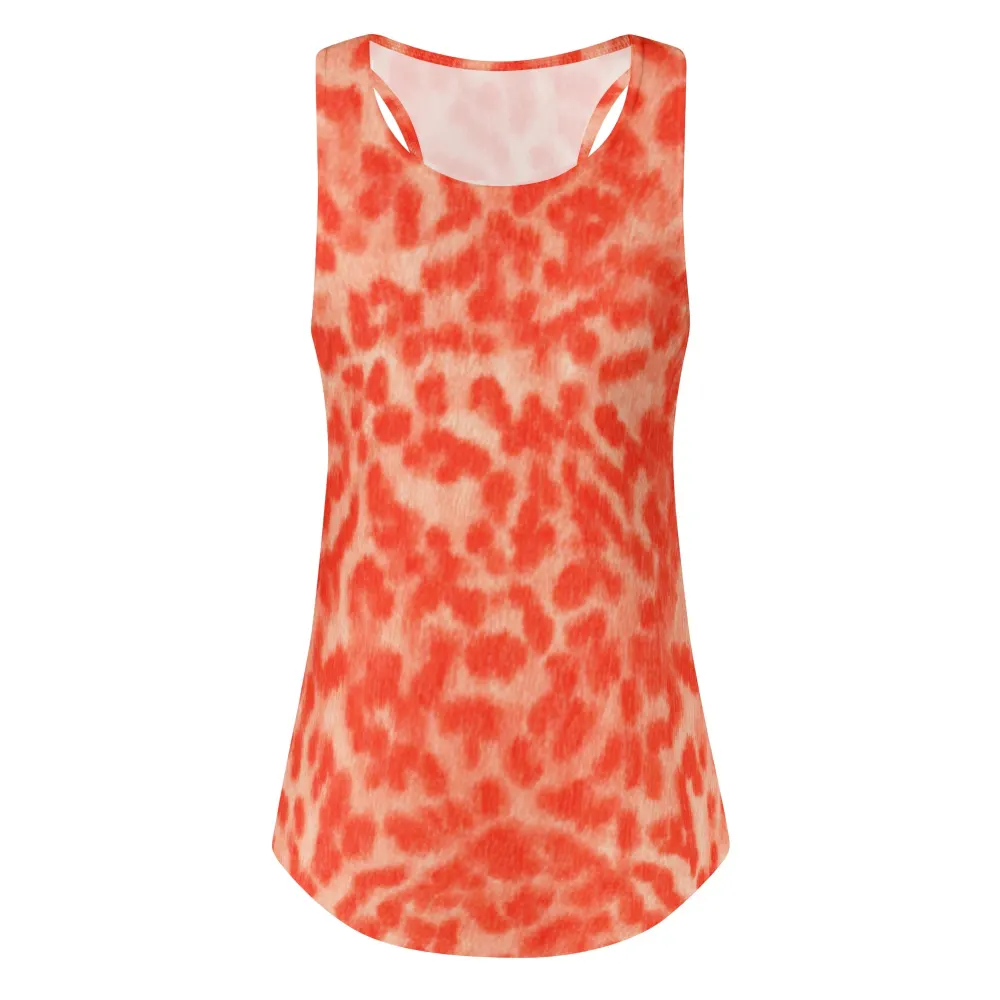 Tags: Animal print tank, Casual wear, Chic tank top, Everyday casual wear, Fashionable, Flowy tank top, Fun fashion top, Fun print top, Leopard print top, Leopard tank, Loose fit, Loose fit tank, Orange tank top, Orange top, Playful print top, Relaxed fit blouse, Statement piece, Summer blouse, Summer tank top, Women's tank top